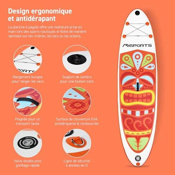 La planche de stand up paddle gonflable MSPORTS suscite l’intérêt des amateurs de sports aquatiques grâce à sa stabilité et sa qualité de fabrication. Son attrait repose sur une facilité d’utilisation combinée à des accessoires pratiques et robustes.